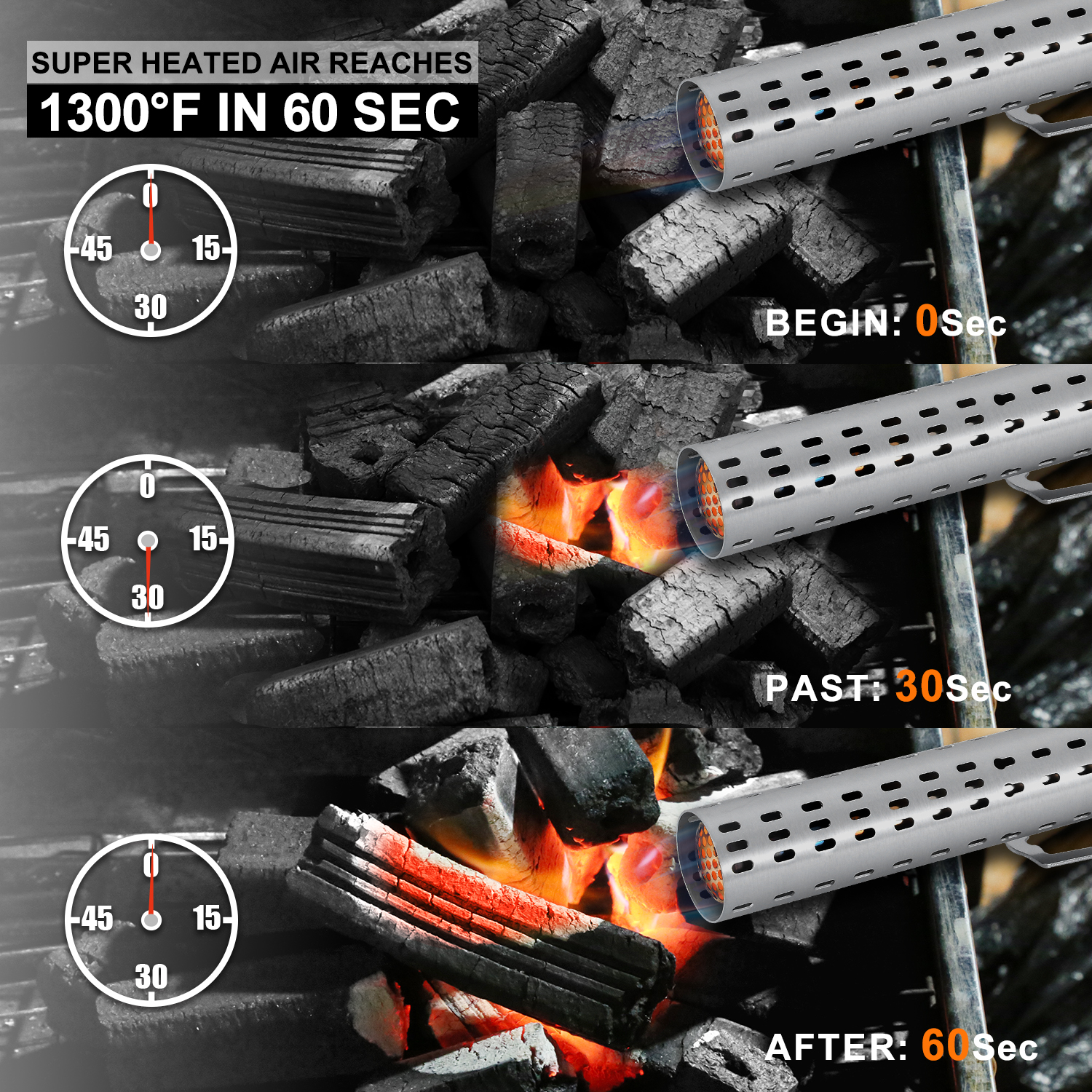 Быстрота: пусковой вентилятор для древесного угля нагнетает перегретый воздух, который достигает температуры 1200°F за 60 секунд и быстро разжигает огонь